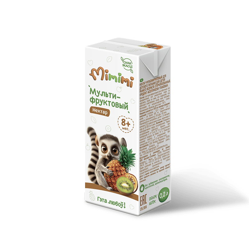 Сок мультифруктовый (сок яблочный, сок мандариновый, сок ананасовый, пюре из персиков, пюре из киви, сок маракуйи), сок яблочный осветлённый, сахар, вода питьевая. Изготовлен из концентрированных соков. Минимальная объемная доля сока – 50 %.